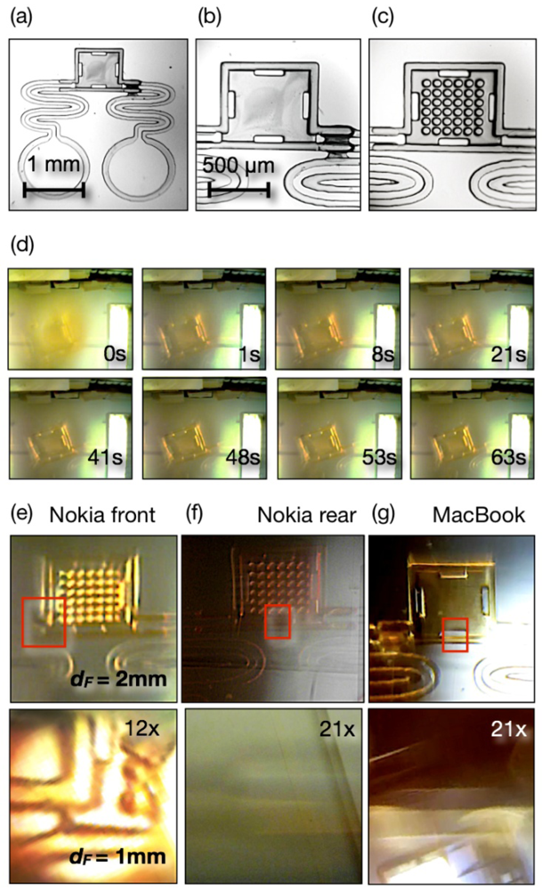 Figure 3(e) is taken from a 176 × 144 pixels frame video acquired with the Nokia 6720 front camera in white ambient light. Even at this low resolution, perhaps the most demanding condition one can propose, it was possible to resolve the 50 μm pillars with an acceptable depth of field. Shifting to dF = 1 mm provided a more than 12× optical zoom (red square in upper panel taken as reference) with enough depth of field to simultaneously capture the base and ceiling of the chamber. Note that the rectangular openings in the chamber were in the ceiling, more than 100 μm from the substrate surface where walls were imaged, and both could be identified.