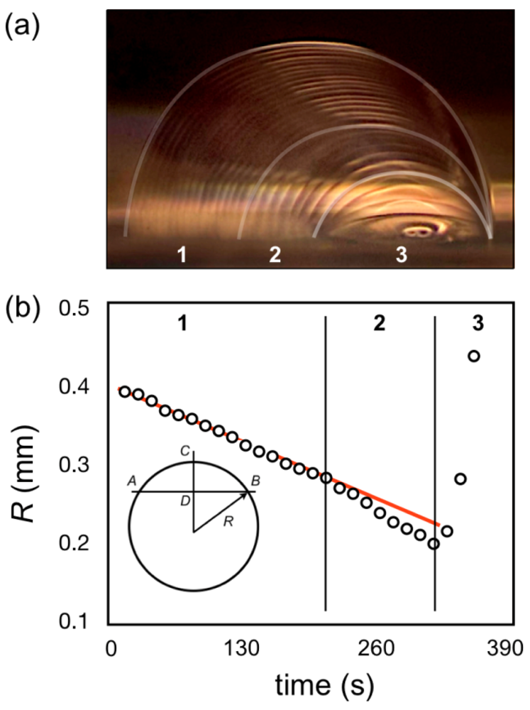 Figure 4(a) illsustrates the transition of a water drop on a PDMS substrate at room temperature as measured at 15s interval. The figure shows three different regimes in the behavior of the drop. In the first regime (1 in Figure 4(a)), occurring for about half of the recorded time, the contact angle remains practically constant and the evaporation changes the drop curvature by reducing the chord and height. In the second regime (2 in Figure 4(a)) the process accelerates, which can be noticed by the larger spacing between captures, and a noticeable change in contact angle, although the drop chord and height keep changing. Finally in the third regime (3 in Figure 4(a)) the changes accelerate even further, but the drop is pinned [18,19] at a constant chord and only the contact angle and associated height changes.