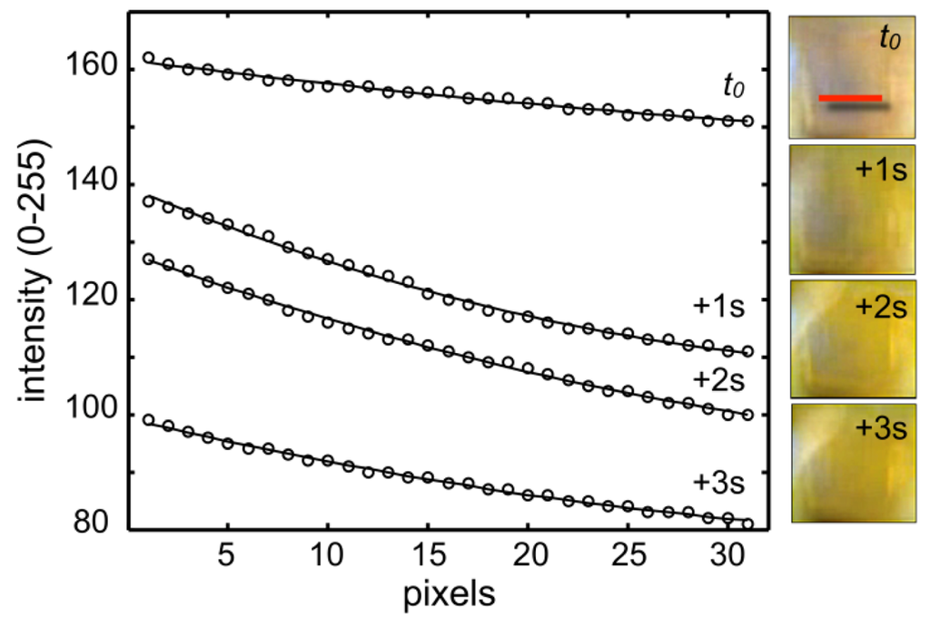 The color change can be more quantitatively rendered by profiling the blue channel of these images along a line (Figure 5, indicated in the t0 panel). This result confirmed that a simple camera could follow a fast chemical reaction in the confined area (0.6 mm2) of a regular LOC element.