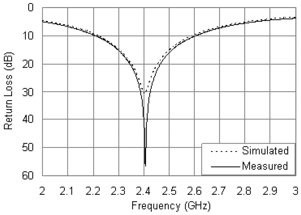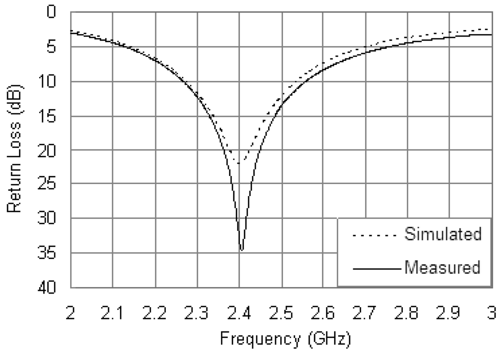 The fabricated prototype of the proposed antenna is shown in Figure 6. A chip resistor in 0402 package was mounted directly onto the bottom surface of the PCB. The loading terminal of the chip resistor was connected to the radiating patch through a small via hole, and the opposite side was directly connected to the ground plane. The via hole was drilled at the position of xR = 16.5 mm and with a diameter was 0.3 mm which complied with the simulation settings. The only variation between the fabricated prototype and the simulation model was the mounting method of the resistor, and the following results showed that the influence of the variation was negligible. The measured and simulated return loss curves are compared in Figure 7. Both the measured and simulated curves are excited at 2.4 GHz with return loss as 56.7 and 30.8 dB, respectively. The measured impedance bandwidth is 17.5% from 2.20 to 2.62 GHz, and the simulated impedance bandwidth is 16.3% from 2.21 to 2.60 GHz. The measured results show good agreement with the simulated ones in Figure 7.
