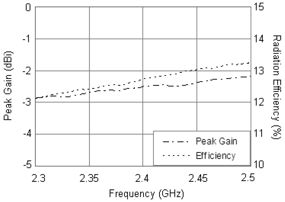 The measured peak gain of the antenna backed with the installation base is plotted in Figure 12 along with its radiation efficiency. The peak gain is between –2.8 and –2.2 dBi within the operating band (2.3–2.5 GHz) with the radiation efficiency is from 12.2% to 13.3%. For the center frequency of 2.4 GHz, with the influences of installation base and resistor loading, the radiation efficiency of the antenna reduces to 12.7% and the peak gain is –2.5 dBi.