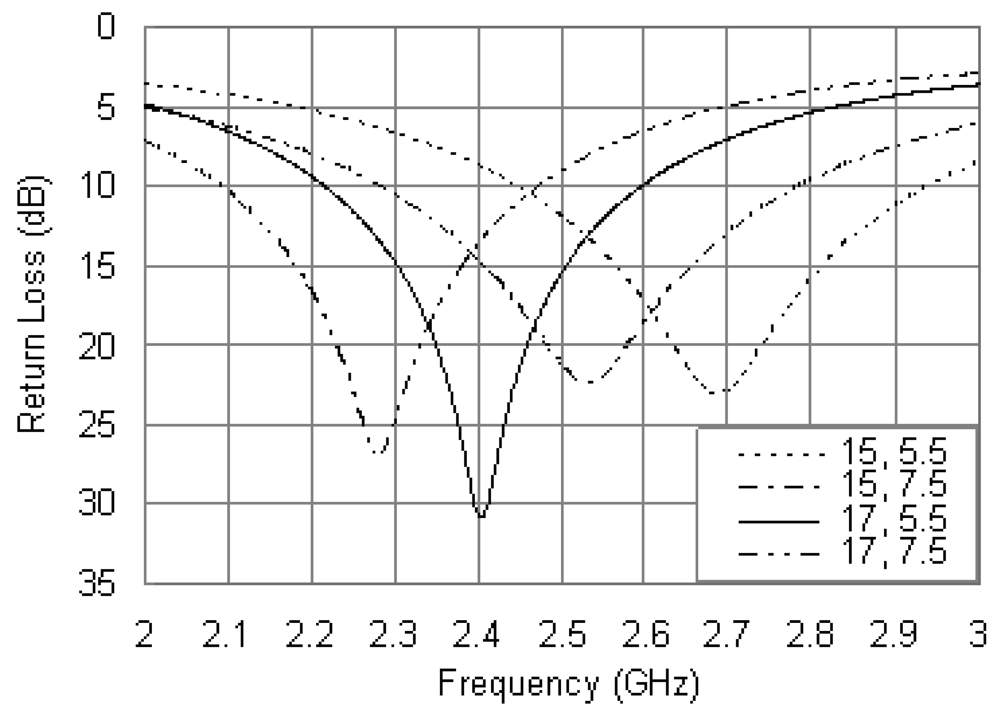 Figure 3 shows the simulated return loss plots for different dimensions of the annular ring with fixed parameters as Rbi = 5 mm, Rbo = 18.5 mm, rP = 0.6 mm, xp = –12 mm, xR = Rro – 0.5 mm, and R = 56 Ω. From the simulated results of Figure 3, it is found that the resonant frequency is very sensitive to the patch size. As the outer radius (Rro) or inner radius (Rri) increases, the resonant frequency is decreased. The antenna impedance is well matched at 2.4 GHz with the combination of Rri = 5.5 mm and Rro = 17 mm, and the impedance matching is degraded while the patch dimensions deviate from the optimum values. Compared with the conventional annular ring patch antenna above mentioned, Figure 3 shows that a greater bandwidth can be obtained. There is also a notable decrease in the bandwidth as the outer radius (Rro) increases, while the inner radius (Rri) causes negligible effects.