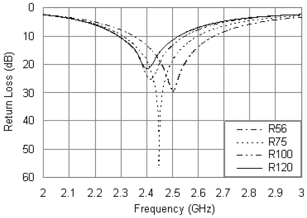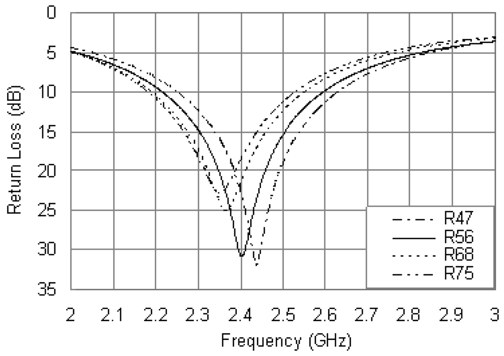 Another important parameter is the resistance of the loading resistor. Efforts were made to optimize the value of R to obtain optimum impedance matching for the proposed antenna. Figure 5 shows the return loss curves for different values of R and fixing other parameters as: Rri = 5.5 mm, Rro = 17 mm, rP = 0.6 mm, xp = –12 mm and xR = 16.5 mm. It is evident that the resonant frequency of the antenna is dependent on the resistance of the loading resistor. As the R value increases, the center frequency decreases with the matching level slightly affected. No significant change in bandwidth is observed with the changes of R. Hence, the value of R can be adjusted to provide better resonant mode and good matching.