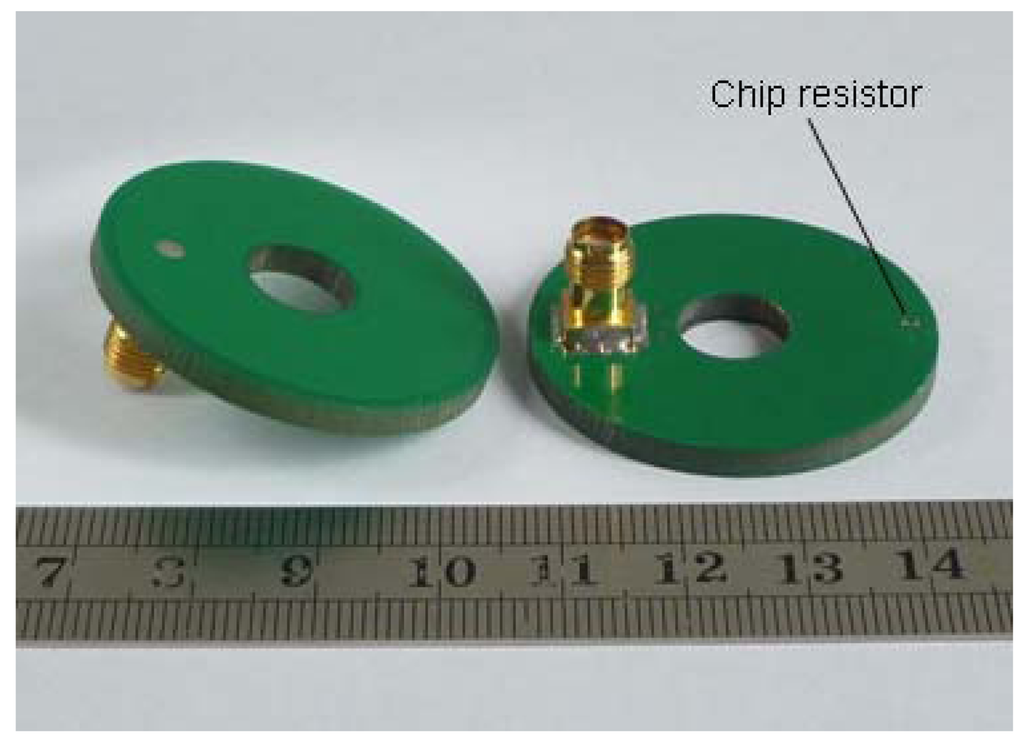 As a conventional annular ring patch antenna with parameter settings above mentioned, the outer radius of Rbo is at least 30 mm at resonant frequency of 2.4 GHz with very narrow bandwidth (as low as 1.7%). It is obvious that a conventional annular ring patch antenna is not suitable for the limited mounting space. As mentioned in Section 1, loading is an effective way to reduce antenna size. In this design, a chip resistor of resistance R was loaded along the x-axis with a distance of xR away from the circular center and the parameters R and xR were selected carefully for impedance matching.