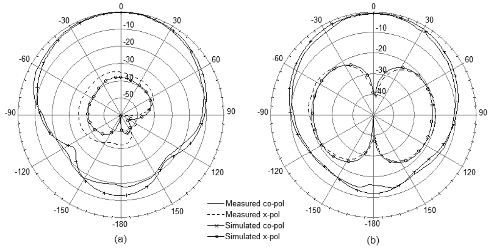 Figure 8 presents the measured and simulated radiation patterns including the co-polarization and cross-polarization in the E- and H-plane. From the measured results the radiation patterns are symmetric and there is minimal ripple in both E- and H-plane which are in good agreement with the simulation. The antenna also shows good cross-polarization level as low as –20 dB. However, due to a small ground-plane size, backward radiations are observed obviously in both planes.