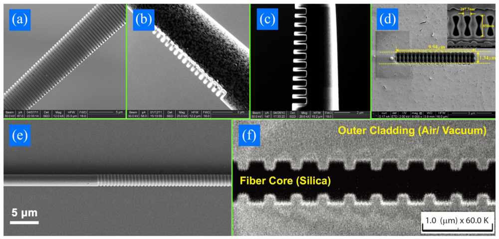 Figure 2 shows FIB/SEM pictures of sMFBGs fabricated from different groups. Gratings in Figure 2(a–c) are fabricated on MF tips while the rest are on tapers. The sMFBGs are fabricated on MFs with diameter ranging from 560 nm (Figure 2(f)) to 6.6 μm (Figure 2(a)) and the number of period of the gratings varies from 11 (Figure 2(c)) to 900 (Figure 2(e)). Both high (5 × 10−3−10−1, Figure 2(c,d,f)) and low (10−4−5 × 10−3, Figure 2(a,b,e)) average RI modulations have been achieved by FIB-milled sMFBG. In all, FIB provides researchers a flexible way to get all kinds of structures with high accuracy at will and without additional masks. Yet, batch production cannot be envisaged for this method.