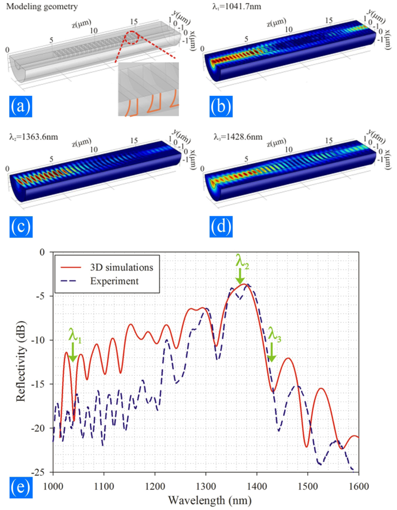However, due to the large index difference in the corrugation region in sMFBGs, strong scattering may occur. A more effective way to verify the experimental spectrum obtained from the sMFBG is a 3D finite element simulation, shown in Figure 5. This method takes the details of the structural deformation into consideration and thus better reflects the real situation experienced by the light field.