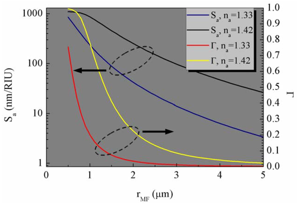 The notable distinction between MFBGs and conventional FBGs lies in that the MFBG large evanescent field which enables its capabilities for external medium sensing. When a MFBG is operated as a RI sensor, the wavelength shift depends on the change of na. Sensitivity with respect to the ambient medium RI (Sa) is defined as