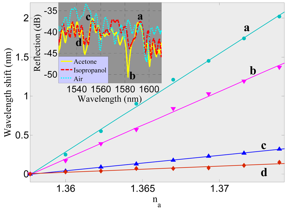 - Liang, R.; Sun, Q.; Wo, J.; Liu, D. Investigation on micro/nanofiber Bragg grating for refractive index sensing. Opt. Commun. 2011, 285, 1128–1133. [Google Scholar]