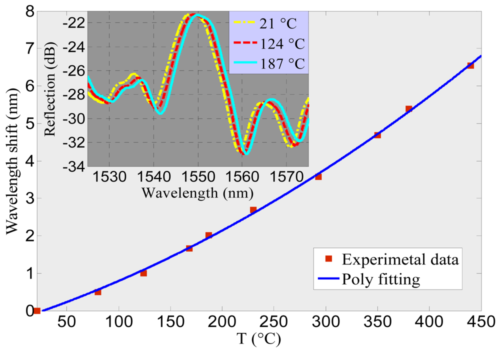 Temperature affects the Bragg wavelength shift through the thermo-optical and thermal expansion effects in three ways: index variation, MF radius variation and the grating period change, each of which is represented in Equation (7). The temperature sensitivity (ST) can be defined as: