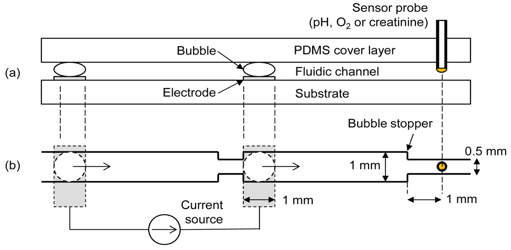 To achieve the maximum degree of oxygen manipulation with minimum pH artifact, two important parameters needed to be optimized; the final distance between bubble and sensor following shifting of bubble and the current density for electrolytic bubble generation. Experiments were conducted using a commercial pH sensor and an oxygen sensor to determine the optimum values of these parameters. The fluidic chip contained a cover layer, an electrode substrate and a sensor probe as in Figure 1(a). The cover layer was made of polydimethylsiloxane (PDMS) containing the fluidic channel patterns. Separate needle-type sensors (pH, oxygen or creatinine) were interchangeably inserted into the elastic PDMS cover layer for different measurements. A pair of oxygen and hydrogen bubbles was generated by a pair of platinum electrodes on the substrate. A bubble stopper as shown in Figure 1(b) was placed at the required distances so that the final distances between the sensor and bubble stood at 5 mm, 3 mm, and 1 mm, respectively, after bubble shifting. Figure 1 shows the case of 1 mm design. The right-side electrode is separated by 5 mm from the sensor probe, implying that there is no bubble shifting procedure for the case of the 5 mm design. Depending on the polarity of current, either oxygen or hydrogen bubble was generated at the right-side electrode. This right-side bubble controlled the oxygen microenvironment near the sensor. The used bubbles were easily removed by a simple fluidic manipulation.