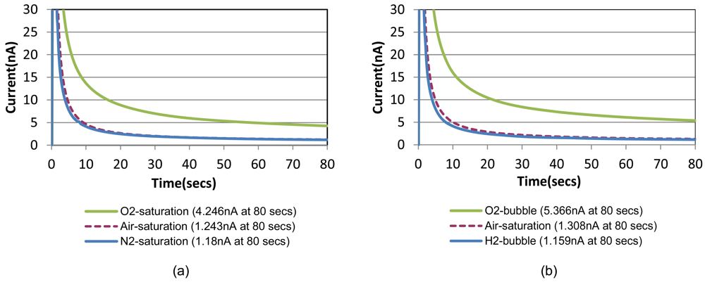 Figure 3(a) represents the time responses of oxygen saturation percentage for final distance between oxygen sensor and bubble as 5 mm. The plots show that the oxygen saturation remains around 21% (i.e., air saturation) for all current densities when no shifting of bubble has taken place after the bubble generation phase. The bubble generated at maximum distance of 5 mm from the sensor is not effective at all to cause any change in oxygen environment near the sensor. It is considered that a significant portion of generated dissolved oxygen nucleates the bubble at the electrode surface rather than migrating into the bulk solution. In addition, the lower diffusion coefficient of oxygen in water (2.42 × 10−5 cm2/s), than those of proton (9.31 × 10−5 cm2/s) and hydroxyl ion (5.27 × 10−5 cm2/s) [14], appears to contribute to this little response compared to that of pH in Figure 2(a).