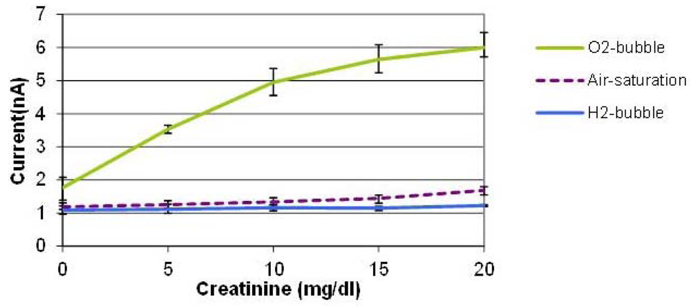 Chronoamperometric responses of the prepared sensor are shown in Figure 4(a) for sample solutions with a fixed creatinine concentration of 10 mg/dL with three different oxygenation states. They are nitrogen-saturated (i.e., oxygen-depleted), air-saturated, and oxygen-saturated states established by purging gases into the sample solution in a beaker. Figure 4(b) shows the responses for the same creatinine concentration with the different oxygenation conditions achieved by the bubble method in the chip. A step-wise 0.8 V potential was applied to the sensor working electrode at t = 0 s that is same as t = 150 s in Figure 3 (i.e., 30 safter the shifting). Figure 4 compares very similar chronoamperometric responses and oxygen dependency from these two measurement approaches using a same sensor. This fact confirms that our simple fluidic chip can effectively serve as a miniaturized oxygen manipulator for our application.