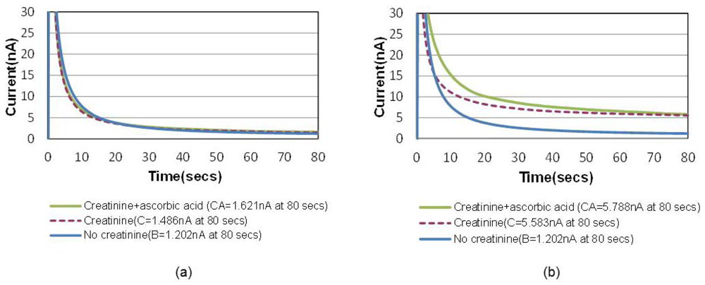 Many facts were confirmed from the pH and oxygen analyses. As expected, the higher the current density used, the easier to reach the oxygen saturation or depletion states. The closer the bubble moves to the sensor, the higher is the degree of oxygen saturation or depletion. For our application, we need to choose optimum current density and distance to reach the maximum oxygen saturation or depletion state with minimal pH perturbation. From Figures 2 and 3, it can be concluded that the optimum condition is 5.5 mA/cm2 with a final distance of 1 mm. Also from Figures 2(c) and 3(c), the best timing to start the chronoamperometric creatinine measurement (i.e., application of step-wise potential to working electrode to result in well-known exponentially decreasing current responses) was determined to be 30 s after bubble shifting when the pH was recovered to its original value while the oxygen change still remains effective. Therefore, all creatinine measurements were done under these conditions.