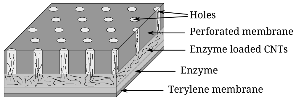 Since the discovery of carbon nanotubes [] they have been used in various applications. Due to their unique structural and electric properties, carbon nanotubes (CNT) have been used to build highly sensitive biosensors [–]. Recently, an innovative approach in the design of biosensors with the CNT mesh deposited on the polycarbonate perforated membrane has been proposed [], and a novel family of mediated biosensors acceptable for detection of wide range of carbohydrates have been designed []. The use of CNTs opens an opportunity for the direct electron transfer between the enzyme and the electrode []. The application of glucose dehydrogenase and CNTs permitted to build mediator free glucose biosensor [].