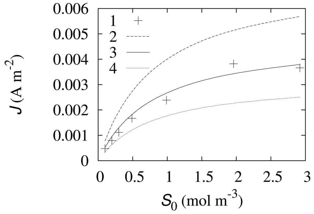 As it can be observed in Figure 2, the responses obtained in numerical experiments using α = 0.005 are close to the experimental data. At that value of α, the relative error of the simulated steady state responses is less than 10%, except two concentrations S0 of the substrate: S0 = 0.199 and 0.299 mol m−3. At low substrate concentrations the relative error reaches almost 20%. Taking into account relatively low biosensor currents and possible measuring errors in the physical experiments, the error of the simulated responses can be considered admissible. The fitted value 550 s−1 of the electrochemical reaction rate constant k2 suitably matches with reported values of apparent heterogeneous electron transfer rate constants [].