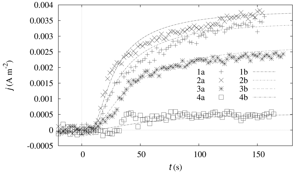 The proposed model was also validated at the transient conditions. The simulation was carried out using the same biosensor configuration as in the simulations shown in Figure 2. The dynamics of the simulated density j(t) of the biosensor current along with the corresponding experimental data are shown in Figure 3. The oscillations in the experimental data shown in Figure 3 are caused by the measurement errors. Due to relatively low output currents, the errors are relatively high. Taking into account the measurement errors, the simulated responses can be assumed adequate to that observed in the physical experiments.