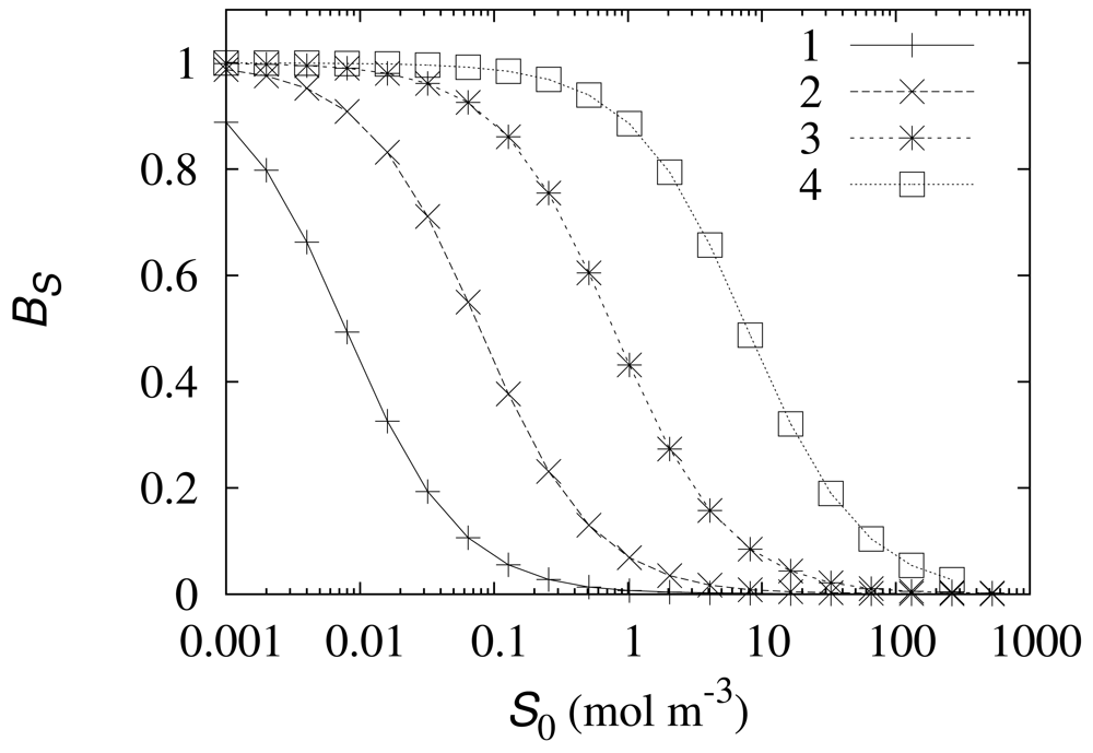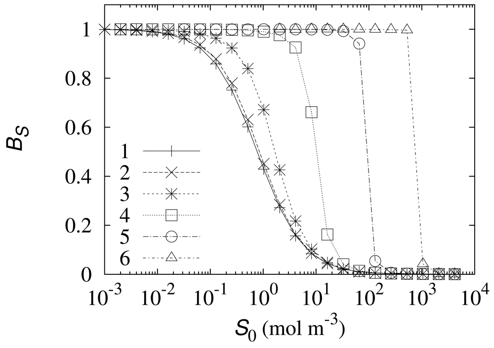 As one can see in Figure 4, an increase in the enzyme concentration E0 noticeably prolongs the linear part of the biosensor calibration curve, ensuring qualitative determination of higher substrate concentrations. The linear part of the biosensor calibration curve corresponds to BS ≈ 1. At the high enzyme concentrations (E0 > 40mol m−3) the length of the linear part of the calibration curve is practically proportional to the enzyme concentration E0, while at the low enzyme concentrations (E0 < 4mol m−3) the sensitivity of the biosensor loosely depends on the concentration E0. The especially drastic change in the sensitivity appears at the moderate values of E0. Figure 4 shows that a tenfold increase of the enzyme concentration from 45.5 (curve 4) to 455mol m−3 (curve 5) leads to an approximately 50 times longer linear part of the biosensor calibration curve.