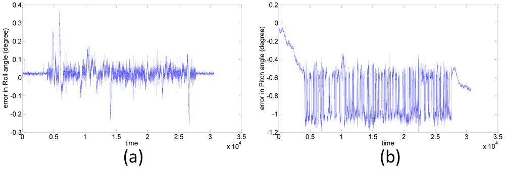 The travel time of the van test is about 50 minutes and this test includes straight lines and sharp turns to simulate a UAV photogrammetry scenario. Figure 17 shows the positional errors of the proposed POS module in the east, north, and up directions, respectively. The preliminary result shows that the RMS errors of the proposed POS module in the east, north and up directions are 0.77, 0.66, 0.83 m, respectively. The RMS errors with roll, pitch and heading angles shown in Figure 18 are 0.02, 0.74, 0.31 degrees, respectively. This experiment verifies that the accuracy of proposed POS module outperforms the traditional SPP mode applied by most commercial photogrammetric UAV platforms.
