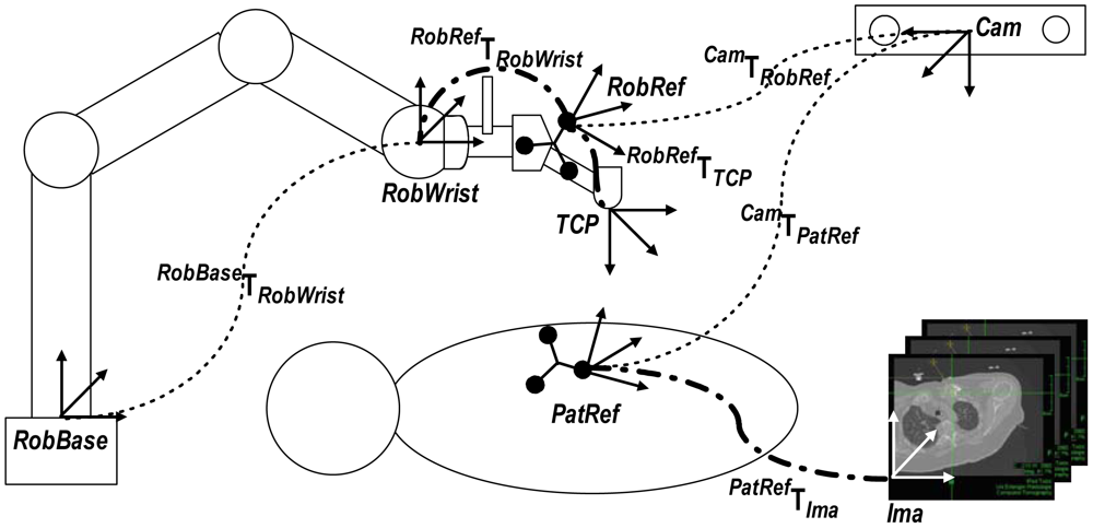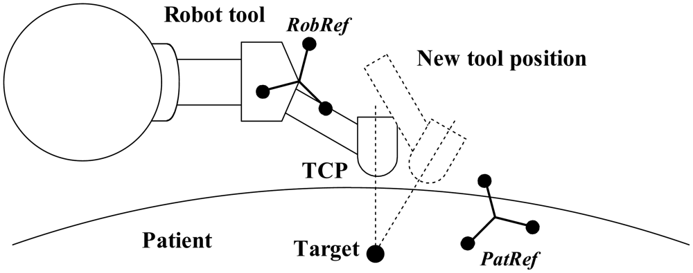 Selecting the TCP coordinate system as a mutual point to match both measurement systems (the robot encoders at one side and the navigation camera on the other) it is possible to calculate the rigid transformation between them. The unknown transformation matrix RefTRobBase can be determined once by moving the robot along the work space and calculate the TCP position using Equations (7,8):