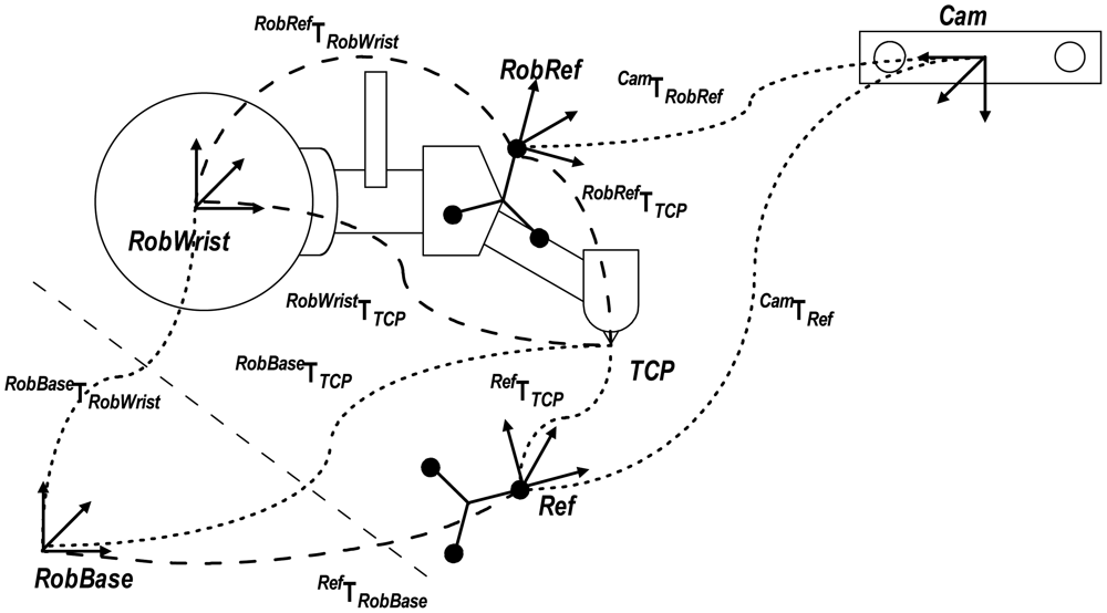 The calibration process consists in finding the transformation RobRefTRobWrist and the transformation RobRefTTCP. Once these transformations are estimated the whole chain of the system transformations are known. For the user, the calibration procedure consists of two simple steps: