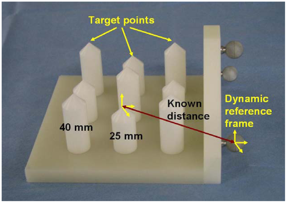 These measurements were performed using a specially designed testing device and an Artis zeego imaging system for error visualization. The testing device consists of nine rods with tips distributed along different positions Figure 16. The height of the higher five rods was 40 mm (from the base to the tip) while the height of the smaller four rods was of 25 mm. A DRF was attached to one side of the testing device. The distances from the DRF's coordinate system to the rod tips were known in advance. The construction accuracy of the testing device is about 0.01 mm.