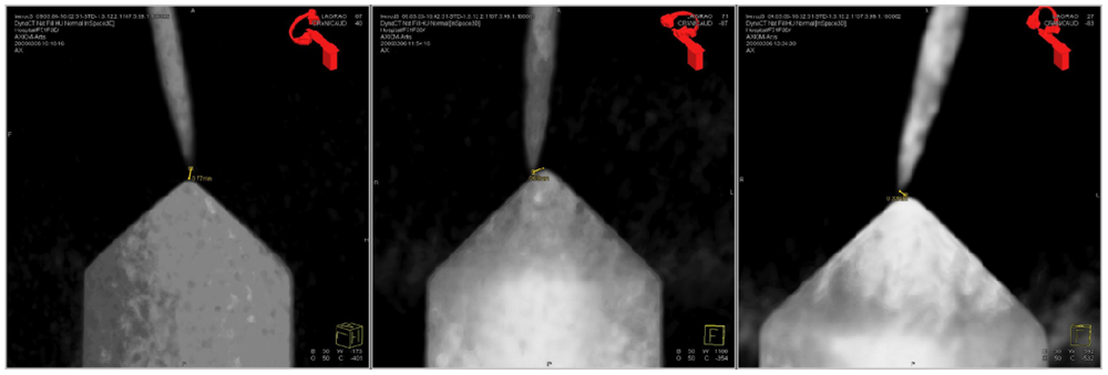 For the experiment, the trolley with the robotic system was placed at one side of the CT-table. The robot's tool was positioned over the testing device, which was positioned on the CT table, using the gravity compensation mode. Using the graphical interface, the robot system was programmed with the position of the selected tip. The TCP was positioned accordingly over the selected tip using the joystick control mode. After an automatic orientation command, selected in the graphical interface, the robot orientated the TCP pointing to the target. The angle from the rod's vertical to the TCP did not exceed 45 degrees. The experiment was performed using different trajectories lengths at each rod (30–60 mm). Then, the robot was stopped by activating the robot's brakes and a 150 mm needle with 2 mm of diameter was inserted until the tip reached the rod's peak. A CT scan (20 s, 200° rotation range) was performed and reconstructed using a high resolution kernel with 512 × 512 matrix and 0.13 mm voxel size. The distance error was defined as the measured distance from the needle's tip to the rod's tip in the CT images (Figure 17).