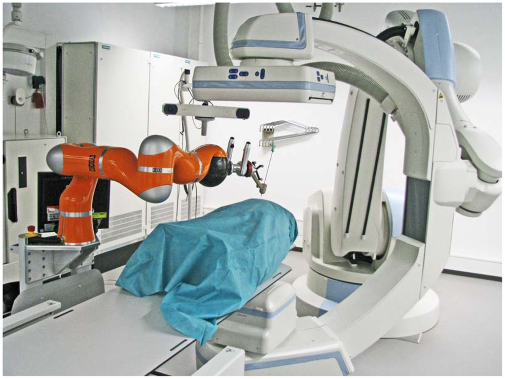 One of the impediments of using robot systems with imaging devices is that the gantry size of the later is not big enough to house both the patient and kinematics of some robots [21]. Many collision issues arise from these kind setups and this is one of the reasons that many researchers have built small dedicated robot systems which fit into the remaining place. A newly FD-CT system (Artis zeego, Siemens Healthcare, Forchheim, Germany) employs a robot arm (KUKA Robots, Gersthofen, Germany) for increased movement flexibility [17,22]. This system can be used for flexible intraoperative imaging and could be coordinated with other robotic systems to assist the surgeon.