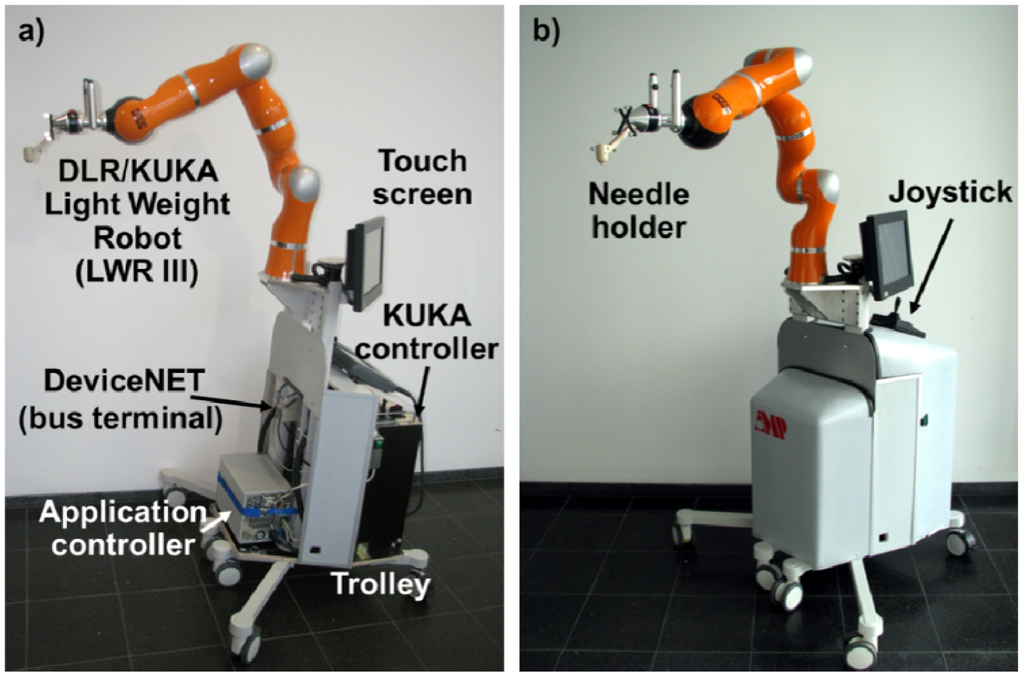 As pointed out, the needle insertion robot is mounted on a mobile trolley, together with its manufacturer controller and a dedicated controller for the application (Figure 3). The trolley can be placed near the operating table so that the robot arm could be positioned near the patient without interfering with the C-arm trajectory. In order to do it intuitively, the robot has special control modes. The needle insertion robot is a third generation DLR/KUKA Light Weight Robot (LWR III) [7] especially designed for safe human-robot interaction. Due to the fact that this robot has carbon fiber covers and an aluminum skeleton it only weights 14 Kg. All sensors (including encoders, bumpers, and others), motor controllers and cables are integrated into the arm, which makes this robot good for manipulation in a crowded environment in which safety is of mayor concern. The robot has seven rotary joints; in contrast to six d.o.f. robots, its additional joint allows to change the elbows position without affecting the pose of the robot's tool. In every joint of the robot, a torque sensor measures the forces exerted. One of the mayor advantages of this setup is that the robot can be used in a so called gravy compensation mode. In this control mode, the robot arm can be moved by picking the robot with the hand with almost no resistance [27]. Once the user stops pulling or pushing it (on any part of its structure) it stays in its position waiting for the next movement. It looks quite similar like an object inside a spaceship, where gravity is not present. If some parameters of the control mode like virtual weight, friction and spring force (which can change the behavior of the compensation mode) are necessary to change, the programming interface of the manufacturer controller have the option to do it. At the bottom of the mobile platform are mounted the manufacturer real-time controller (KRC, KUKA Robot Controller) and the application controller. Attached to the trolleys inners frame there are different sensors for safety purposes which will be described in the control system section.