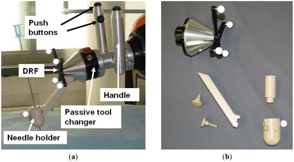 In order to track the needle with the optical localizer, a dynamic reference frame (DRF) is attached to the needle holder (Figure 4(a)). The device that will carry the needle is the beige piece placed at the tool front. It is completely PEEK fabricated to ensure biocompatibility. In addition, its properties make this material artifact free in the CT-images. The needle holder can carry out different inserts to support varying needle or tool diameters.