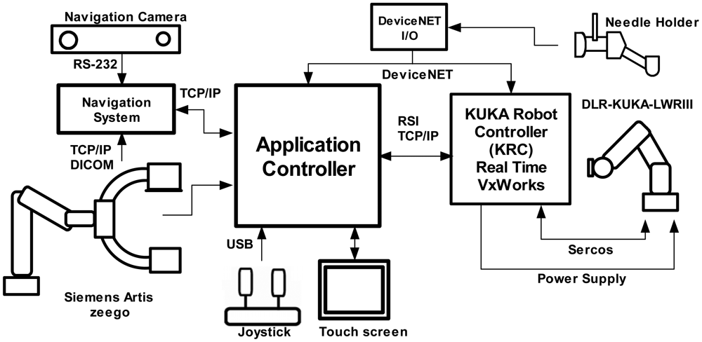 The application controller main task is to centralize the data coming from all the system components, process this information and to send orders to be carried out by the actuators. The application controller gets sensor data from the real-time controller (robot pose and force measurements), the optical localizer (reference frames positions and orientations), the robot-driven angiographic system (2D projections and 3D-image reconstruction) a touch screen (user planning instructions) and a joystick (user command movements). The authors implemented the controller in a bare bone PC with Windows XP as operating system. Figure 5 shows an overview of the system components and their communication protocols with the application controller.