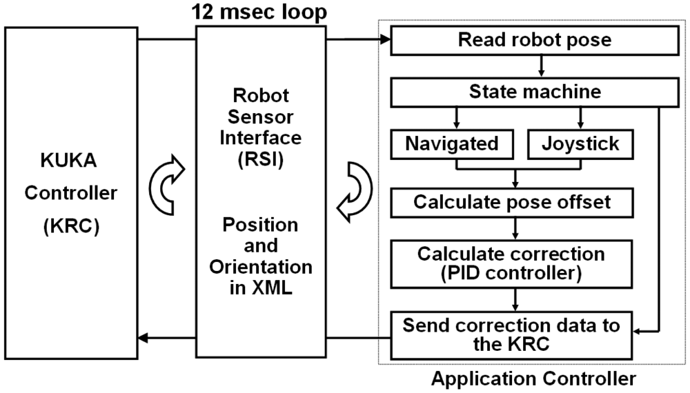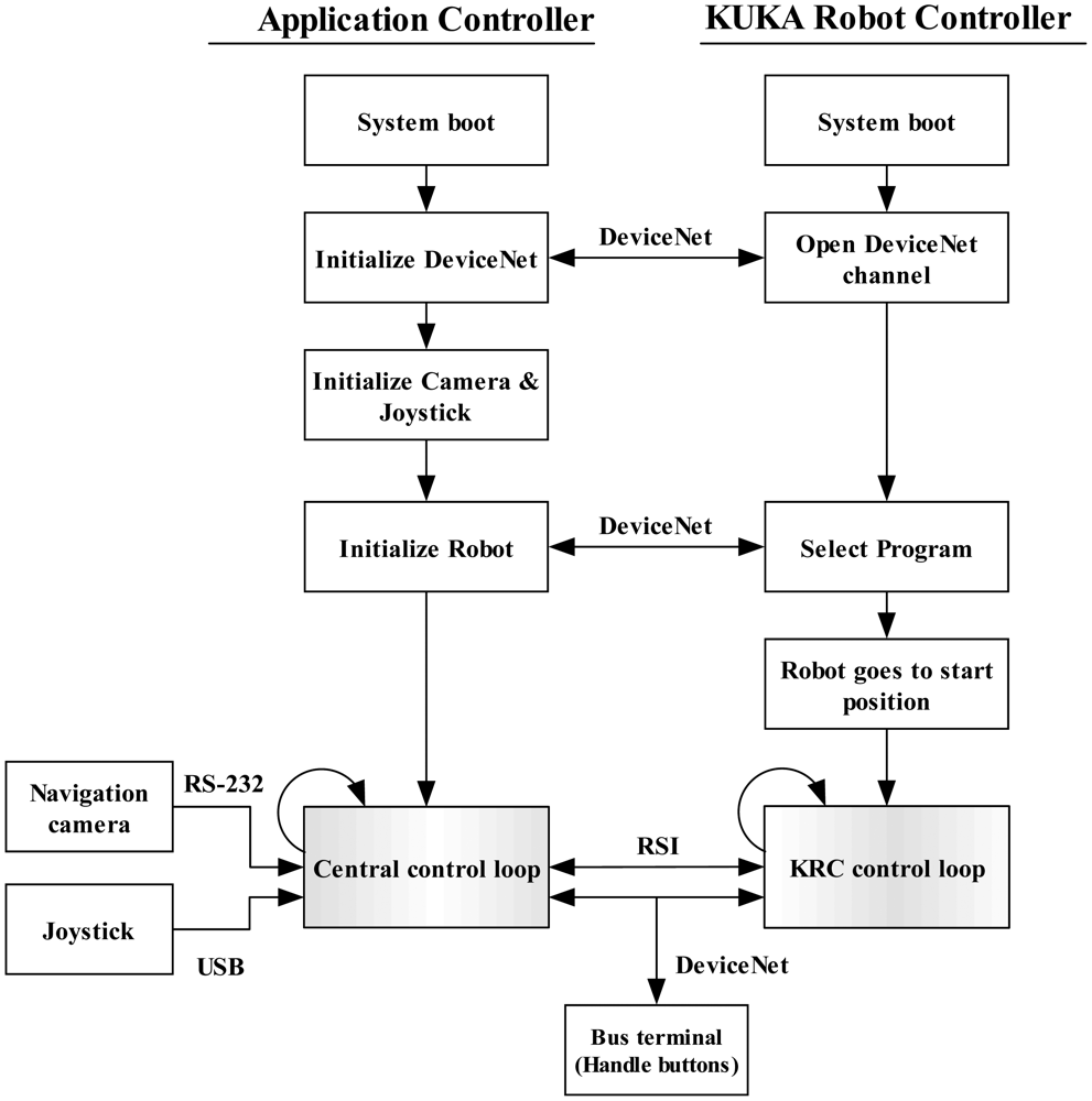 The system program sequence can be seen in Figure 6. After booting, the application controller initializes the DeviceNet protocol and opens a communication channel with the KRC. Internal variables of the KRC that have direct influence on the robot's configuration and motion can be controlled externally by the application controller. Such variables can, for example, switch on/off the brakes, trigger an external stop, select a program, alert when a configuration lock is activated or the robot kinematic is not calibrated, etc. Then, the joystick and the camera are initialized. To do this, a USB channel is created for the joystick and a serial communication for the camera is established. Afterwards, the robot initialization is started. This includes program selection (on the KRC) using the opened DeviceNet channel. The security locks are then acknowledged and the robot brakes are released. Then, the robot moves to the programmed initial position. A TCP/IP channel is opened in order to exchange data through the RSI. After a command from the application controller, the RSI data exchange starts. This consists of two control loops, one in the application controller called central control loop and a second one in the KRC. Using the RSI, the control loops trigger each other every 12 ms. At every central control loop, the application controller receives data from the navigation system, the joystick and the bus terminal. Then, it sends the processed data to the KRC which in turn carries out the instructions (adjust the robot position). The KRC sends back a package containing the actual conditions of the robot. This data exchange is repeated until the user stops the program. If a delay exists, the data transmission is broken and the robot stops. The control loop is explained in more detail in the next section.
