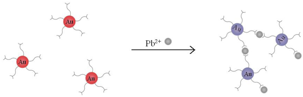 Our AuNP-based HMI sensor was based on the colour change caused by the surface plasmon resonance effect on AuNP aggregation. It is known that normal AuNPs with diameter between 10 nm to 50 nm appear red in colour in water [22,23], as we can see from the tube 1 in Figure 3, when Pb2+ was added, chelate interaction with the carboxylate groups of MUA-AuNPs occurred, which shortens the distance between the gold nanoparticles and formed aggregates. Owing to the inter-particle coupled plasmon excitons in the aggregated states, a red-to-purple color change can be observed in the solutions. As shown in Figure 3, the colorimetric response to Pb2+ resulted in an obvious color change in the number two and three tubes. We challenged the strategy with other metal ions, including Mn2+ and Zn2+, and the experimental results demonstrated that Pb2+ had a much stronger signal (data not shown). Yet to be improved, an obvious megascopic response can only be obtained with concentrations higher than 0.025 mM in solution.