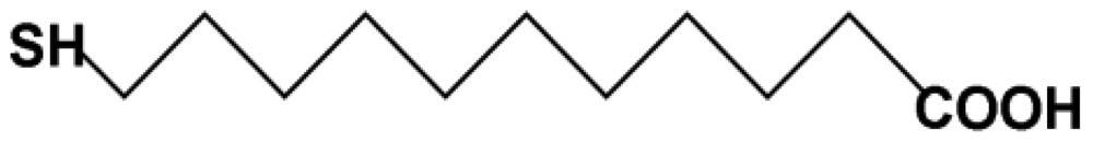PDMS (Sylgard 184) was purchased from Dow Corning (Midland, MI, USA). Chloroauric acid trihydrate (HAuCl4·3H2O), HMIs and 11-mercaptoundecanoic acid (MUA, Figure 2) were obtained from Sigma (St. Louis, MO, USA). Deionized water (18.2 MΩ) produced by the Milli-Q system was used throughout the experiments.