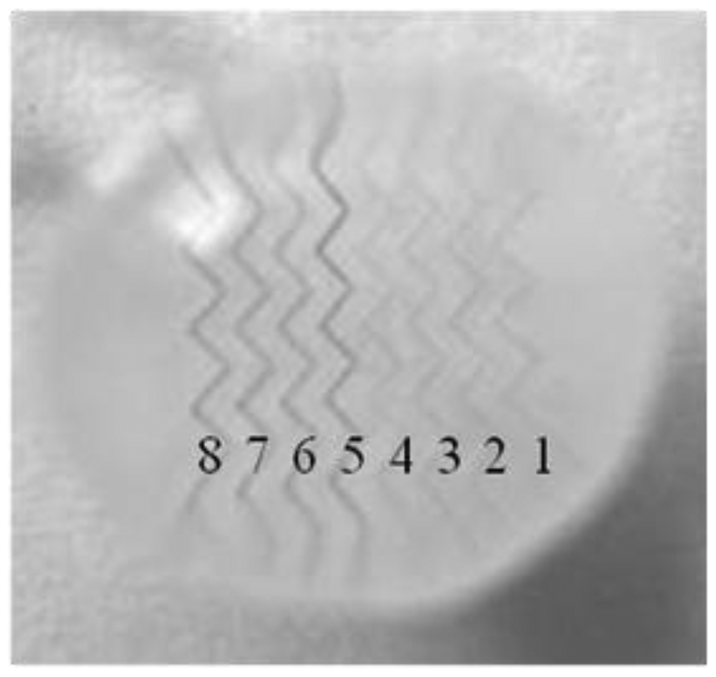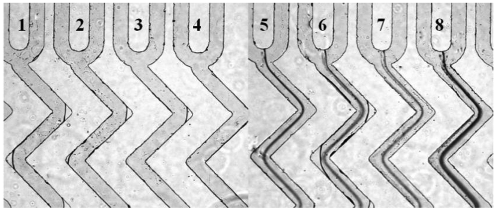 With a high throughout microfluidic chip that include eight microchannels, different concentrations of HMIs can be detected simultaneously. The process of sample injection was the same with the operation of the single microchannel microfluidic chip. The same analysis effect was achieved even on a multi-microchannel microfluidic chip. As shown in Figure 5, the channels numbered from 5 to 8 that contained Pb2+ displayed obvious dark lines. In contrast, the control ions, such as Na+, Ca2+ and Mg2+ did not show any aggregation (lines 1–4 in Figure 5).