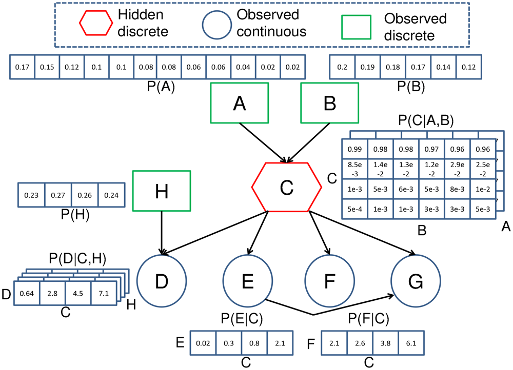 A Bayesian Network (BN) is a model representing the joint probability of a process or problem via a directed acyclic graph. The graph represents the joint probability via a number of explanatory random variables and their associated statistical relationships. In Figure 1, the BN is a joint probability distribution that is used to provide quality assessments of temperature sensor data. The cause and effect tests associated with the network are represented by a set of discrete and continuous variables X = [xA, xB…xH]. Each of the variables in the network are associated with a node (different shapes in Figure 1) representing the conditional probability distribution (CPD) of the variable that is conditioned upon other variables with edges pointing towards it. The nodes that point towards a particular node are known as its parents.