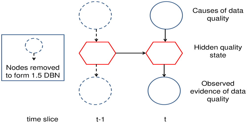 Sensors quite often measure environmental phenomena that are correlated across time. For such phenomena, there will be dependencies between the current quality state and the quality state at previous time steps. The DBN framework shown in Figure 2 adopts the simplest temporal model, a first-order Markov model, where the dependencies between quality states are only modeled between consecutive time steps. When each of the observed variables is singly connected to the quality state, the network can be considered to be a special variant of the Hidden Markov Model (HMM), known as the Input-Output HMM [37]. The hidden state CPD of the standard HMM has static state transition probabilities (i.e., p(qualityt|qualityt−1)), whilst the Input-Output HMM has state transition probabilities with greater dynamics given that they are also dependent upon the causes of data degradation (i.e., p(qualityt|qualityt−1, causest)).