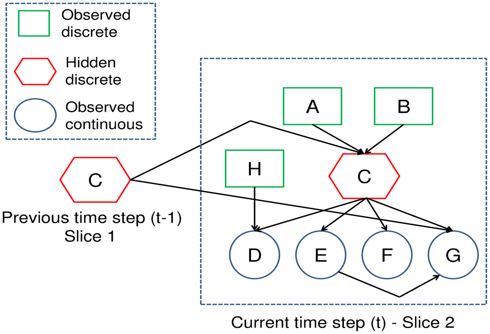 The number of operations required to perform an inference for each time step is bounded between O(KI+1) and O(KI+N) where N is the number of hidden state variables in the current time slice, I is the number of variables in the forward interface (number of variables with children in the next time slice) and K is the number of states per hidden variable [33]. The complexity of this inference would be computationally prohibitive in a network where the state space was comprised of a significant number of variables dependent upon the next time step. The interface algorithm was suitable for our proposed framework as the quality inference in the current time step was only dependent upon the quality state of the previous time step. If the framework was modified so that variables in the current time slice had numerous parents in the previous time slice, the interface algorithm would be computationally infeasible. Exact inference may still be possible, however, the frontier algorithm [33] would be a better option. The minimal complexity of the frontier algorithm is O(NKN+1) per time step, and hence, it is computationally feasible as long as the hidden state space remains low. If this is not the case, an approximate inference engine might be necessary [33].