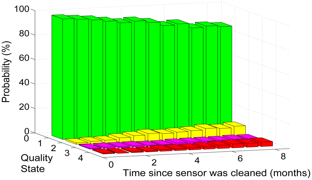 The second variable was related to bio-fouling, which is the major cause of sensor degradation in shallow marine environments. Bio-fouling of sensors in shallow seawater can occur very rapidly and lead to random fluctuations or offsets in data in less than two weeks [36]. Bio-fouling has been found to produce drifts in the type of conductivity sensors that were used in Sullivans Cove [36]. A general rule of bio-fouling drift is that, the longer it has been since the sensor was cleaned, the greater the uncertainty associated with its measurements. Consequently, the number of days since the sensor was last cleaned cl was represented as a multinomial distribution (node B in Figure 3) with a monthly resolution for both the temperature and conductivity based DBN. Figure 4 is the CPD of the conductivity sensor at 1 m depth with the quality states conditioned upon the time since the sensor was cleaned p(q(t)|cl(t)). The CPD was trained with the data set specified in Section 6.4. It can be seen there is a trend of the probabilities associated with the “degraded” quality states increasing and the “good” quality class decreasing as the time since the sensor was last cleaned extends.