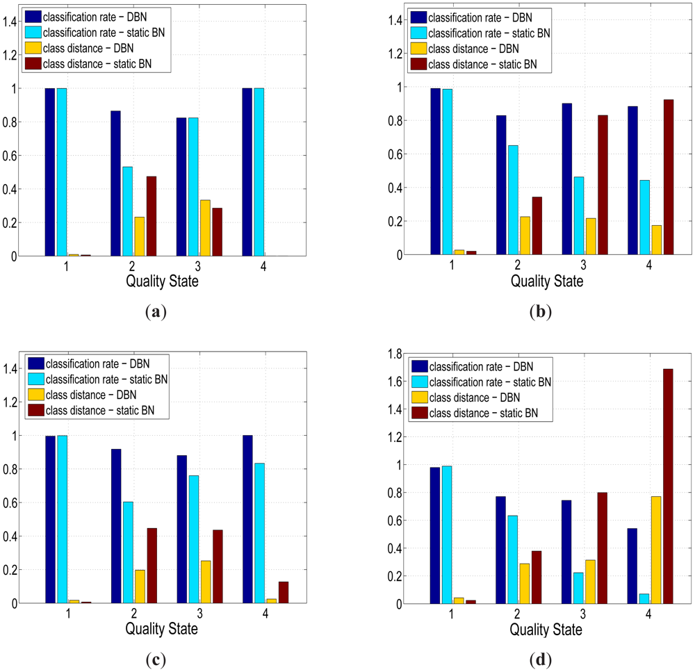Figure 6 shows that the quality assessments generated by the DBN and static BN were in close agreement with the expert based quality assessments for each of the four sensors. The average quality assessment accuracy of the temperature sensors (Figure 6(a),6(c)) was higher than the conductivity sensors (Figure 6(b),6(d)) with an improvement of 1.22%, 11.4%, 3.65% and 40% for the good, probably good, bad but potentially correctable (to be referred to as probably bad from this point) and bad quality states respectively. The average quality assessment accuracy for the good class of sensor data was 99.1%, which was consistently higher than the remaining quality classes. The average assessment accuracy was lowest for the probably bad class at 83.7 % although still relatively close to the average accuracy of the probably good quality state of 84.6% and bad quality state of 85.6%.