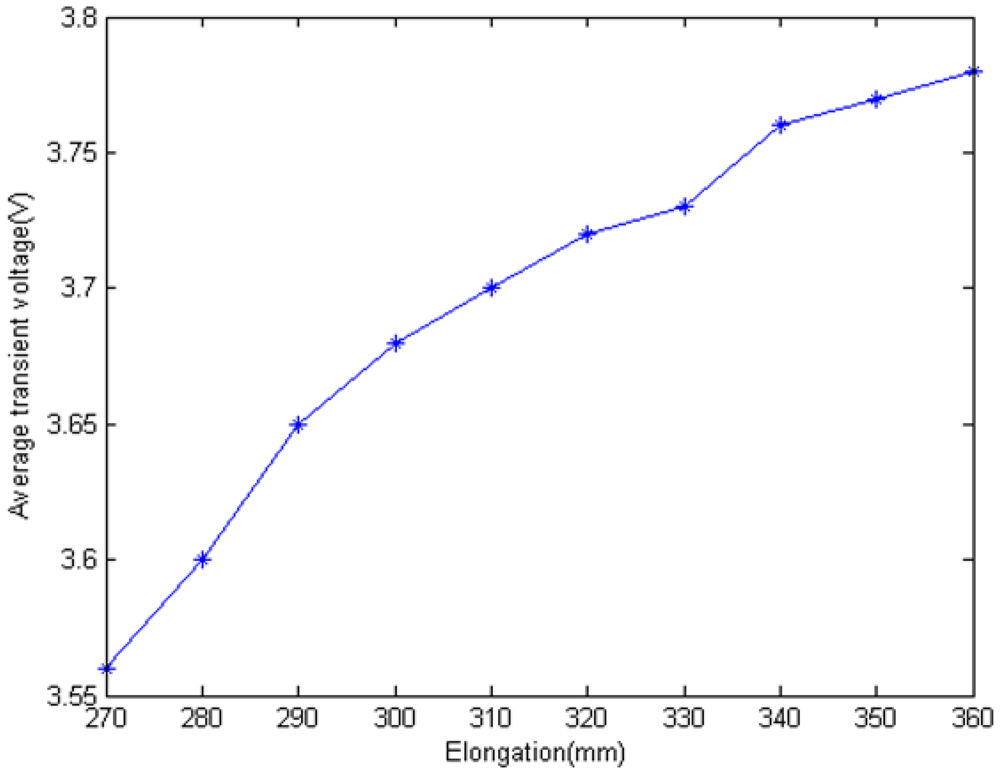 Figure 12 shows the transient voltage waveform in the EHTSC. The step signal voltage US created by the signal generator is 5 V. Because of the sensing cable impedance, the transient voltage is lower than the step signal voltage. However, the waveform is not a straight line. The change of the transient voltage can be caused by the non-uniformity of the cable's impedance. In order to find the relationship between the transient voltage and the elongation of the sensing cable, the average transient voltage is calculated.