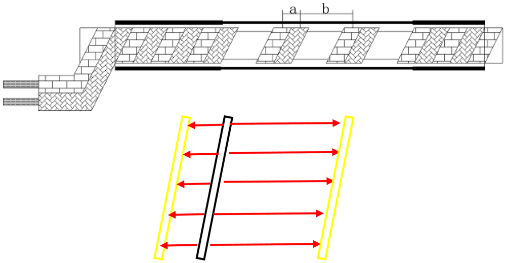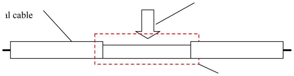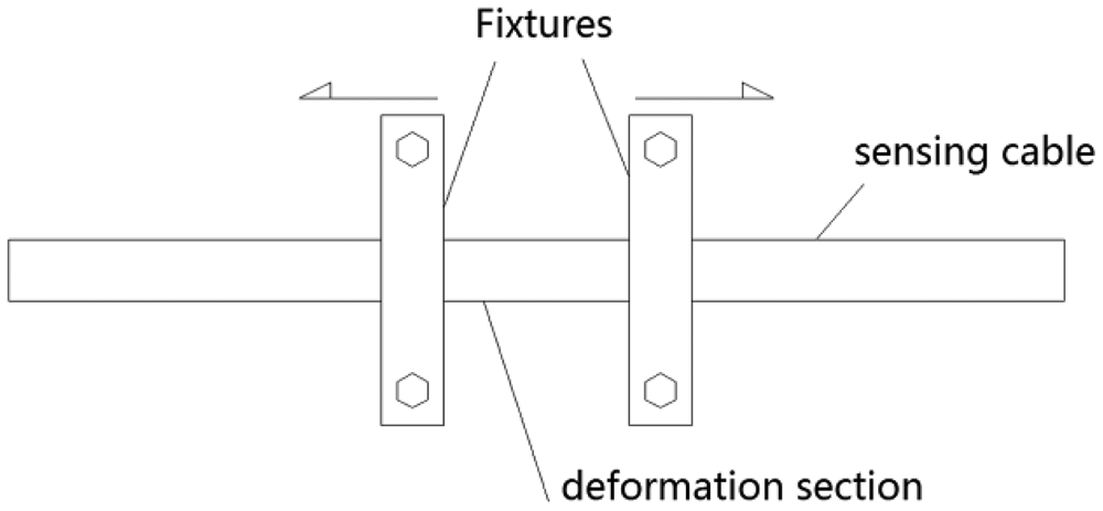 However, traditional TDR sensor cable is hard to apply in surface deformation measurements. Generally, there are two kinds of TDR sensing cables. One is the coaxial cable; the other is the parallel cable (like telephone cable). As Lin did, coaxial cable can measure shear deformation underground, but the TDR sensing cable should have the ability to measure stretch deformation (like BOTDR) in surface deformation monitoring (Figure 3). However, the elasticity of coaxial cable and parallel cable is too small to be used in stretch deformation applications. In order to apply TDR technology in surface deformation distributed detection, an elastic helical TDR sensing cable (EHTSC) is proposed in this paper.