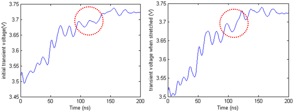 The length of the deformation section is 25.0 mm. Then the deformation section is stretched to 54.6 mm. Figure 16 shows the transient voltage in the initial state and the transient voltage when the cable is stretched. From the waveform in the red circle, we can see that there is a difference between the two waveforms. Compared with non-uniformity influence, the waveform difference caused by stretching is very small. To obtain deformation directly from the waveform is difficult.