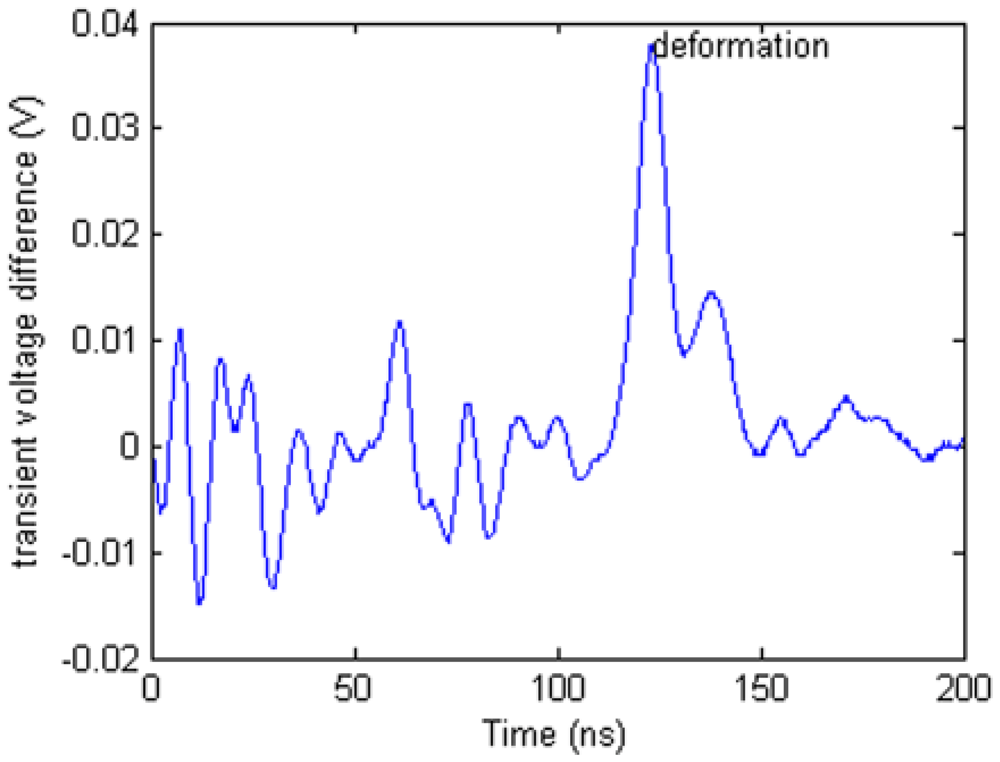 To obtain the local change of the transient voltage, a comparison method is applied in the TDR data processing. The difference waveform in Figure 17 is created by calculating the stretched waveform minus the initial state waveform. There is an obvious spike in the waveform which is ceased by the stretching deformation. Beside the highest spike, there are many other lower spikes. Those spikes can be created by the TDR device measurement uncertainty.