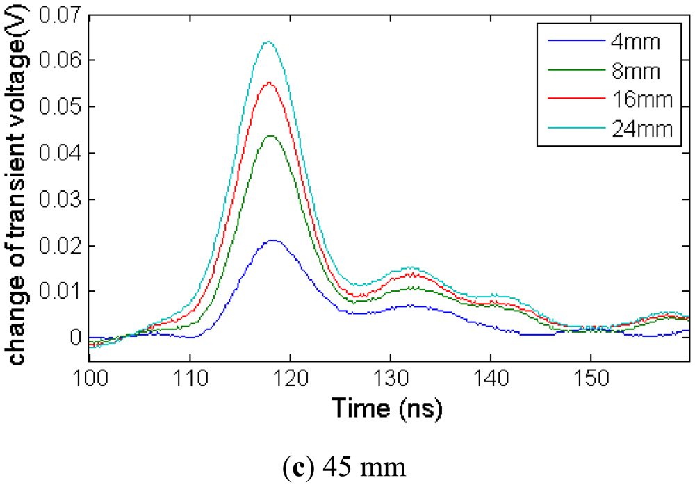 In order to detect ground surface deformation, the relationship between reflected waveform spike and stretching deformation is researched. In this experiment, we select three different deformation sections—25 mm, 35 mm, 45 mm. Figure 19 shows the local deformation TDR experiment results with the comparison method.