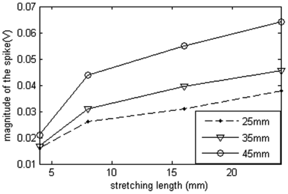 However, the reflected waveform spike magnitude will be affected by the length of deformation section. From Figure 20, we can see that the spike magnitude for the longer deformation section is higher than the others with short deformation sections for the same stretching length. Therefore, deformation length cannot be calculated simply from the spike magnitude.