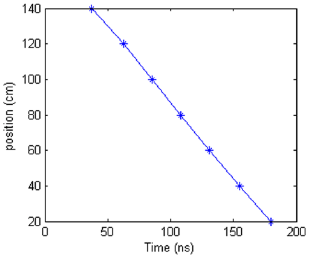 Figure 22 is the relationship between spike positions located by the oscilloscope from Figure 21 and the real deformation positions. It is a linear relationship. If choosing a straight line from the point at 20 cm to the point at 140 cm to fit the experiment results in Figure 22, the max location error is 1.6 cm. Using this method, the deformation points can be located by EHTSC.