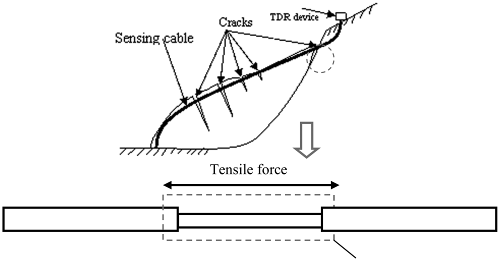 TDR technology has been used in many fields. Using TDR technology, cable fault location equipment can point out where telephone cable is broken or short circuited. It helps workers fix communication networks. TDR is also used in measuring the water content of soils [16,17]. Water content can change soils' dielectric constant, and there is a relationship between soils' dielectric constant and electrical signal's propagation velocity. According to this relationship, Topp measured soil water content with coaxial transmission line sensing cable. Besides water content, TDR technology is also used in underground displacement measurements in landslide monitoring [18–21]. The deformation of soil/rock mass induces the cable's cross-sectional deformation, which then induces the TDR response (Figure 2). Lin measured this deformation with coaxial cable [18].