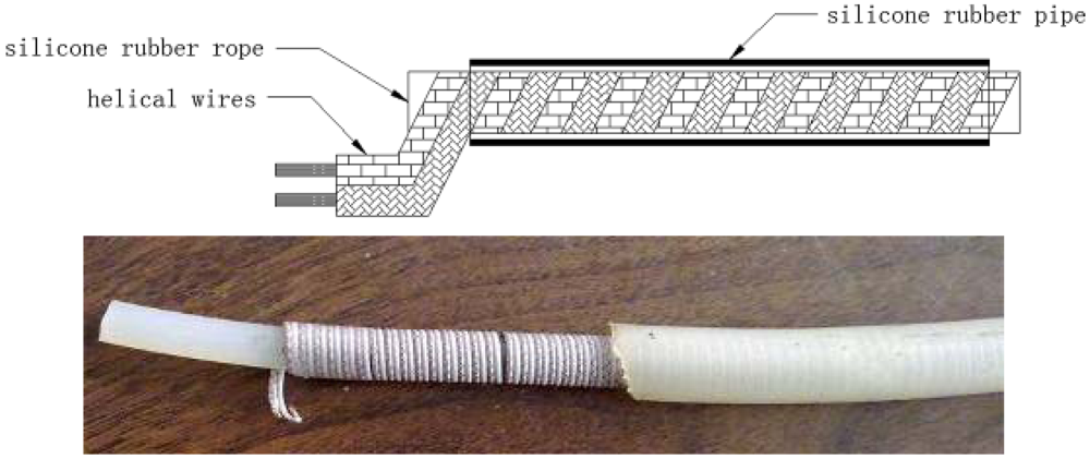 As shown in Figure 4, elastic helical TDR sensing cable has a unique structure compared with traditional TDR sensor cable. In the center of the cable is a silicone rubber rope. A couple of parallel wires coil around the rope. We call them helical wires here. There is a silicone rubber pipe around the helical wires. The silicone rubber pipe is used for keeping helical wires away from water in the ground.