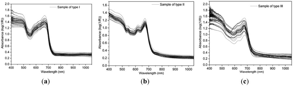 Except of the above similarities, many differences also existed in the spectra among the three types of samples. Comparing Figure 1(a) with Figure 1(b), there were many different absorptive responses within the range from 540 nm to 640 nm. In detail, two small absorption peaks were detected at 540 nm and 610 nm in Figure 1(b), but these absorptive responses did not exist in Figure 1(a). This phenomenon might be caused by the color change along with the variation of MC between type I and type II. The MCs of samples in type I were all bigger than 50%, while those in type II didn't exceed 7%, as shown in Tables 2 and 3. The big variation of MC caused by heating and drying led to huge concentration changes of chromogenic compositions in tea leaves. Former researchers have found that the chlorophyll a and chlorophyll b gradually degrade, and the contents of pheophytin a and pheophytin b increase in manufacturing process [28]. In type III, samples came from eight kinds of processing procedures, and the MCs were distributed in a broad range from 3.7% to 67% as shown in Table 4, so those curves were dispersing in Figure 1(c).